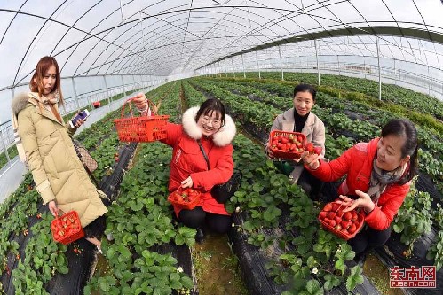 東南網1月15日訊(福建日報 魏永青 魏劍生 攝)近年來,建甌市小松鎮著力培育觀光休閑農業,建設融現代農業、鄉土風情、娛樂休閑、文化教育和農事體驗于一體的觀光休閑農業景區。至目前,該鎮觀光休閑農業面積已達850畝,促進了農業增效,農民增收。圖為12日,在小松鎮湖頭村草莓公園內,游人體驗采摘的樂趣。