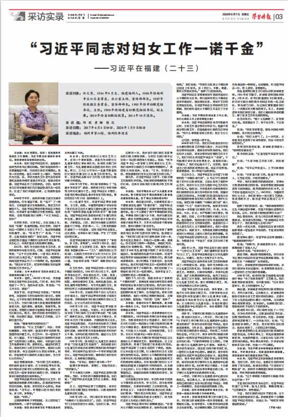 采訪對象:林文秀,1954年9月生,福建福州人。1985年任福州市臺江區委常委、辦公室主任、宣傳部部長。1987年任鼓樓區委常委、宣傳部部長。1993年任市婦聯黨組書記、主任。1998年任福建省婦聯黨組副書記、副主席。2010年任省婦聯巡視員。2014年10月退休。 采訪組:邱然 黃珊 陳思 采訪日期:2017年6月4日初訪,2020年1月9日核訪 采訪地點:福州市芳沁園,福州悅華酒店 采訪組:林文秀同志,您好!您在福州市鼓樓區工作期間,習近平同志任福州市委書記。請您講講您與他相識的過程。 林文秀:我和習近平同志相識,是他剛來福州當市委書記那段時間。當時我是福州市一名普通基層干部,任鼓樓區委宣傳部部長。我第一次見到他,是在1990年七一前夕,當時我作為全國、省、市優秀黨務工作者代表參加市里紀念建黨69周年座談會并發言,座談會結束前,習近平同志作了總結講話。會后,他和市委幾位領導邀請我們幾位基層黨員代表一起吃飯,拉近了我們和他的距離,讓我感到他很親切。 1990年下半年,福州市開展全國衛生城市創建活動。作為基層干部,我“包干”了一些地方,主要是推進衛生死角整治。整治工作開展后不久,習近平同志帶著市里的同志來到鼓樓區,檢查城鄉接合部的衛生整治情況,他看到我,還微笑著跟我打招呼:“林文秀同志,你好!” 檢查結束后,區委書記、區長送他上車,我就“識趣”地退到后面。但沒想到,習近平同志一只腳跨上車后又下來了,他走到我面前和我握手,說:“你辛苦了!”我說:“不辛苦,這是我應該做的!”我很高興,習近平同志能把我們基層干部的付出和辛苦看在眼里、放在心上,對我們是莫大的鼓舞和激勵。 1992年,我作為全國優秀黨務工作者,被組織派到中央黨校學習。行前,習近平同志囑咐我:“這個機會很難得,一定要認真學習,回來以后認真總結。”學習結束后,我回到福州向習近平同志作了一個簡單匯報。他鼓勵我說:“回去好好工作,把學到的理論知識運用到實際工作當中去。” 采訪組:從中央黨校學習歸來的第二年,您就調到婦聯工作了。 林文秀:是的。1993年3月9日,市委通知我去習近平同志辦公室。門開著,我禮節性地敲了一下門,他抬頭看見我,笑著說:“林文秀主任,請進!” 我坐下后,習近平同志對我說:“經市委研究,決定由你來擔任福州市婦聯主任、黨組書記。這個領導崗位非常重要。我們黨很重視婦女工作,全國婦聯主席大多是德高望重的革命老大姐,包括蔡暢、康克清、陳慕華等。我們省里、市里的婦聯原來也都由革命老大姐擔任婦聯主任?,F在,我們開始配備年輕的婦女干部,你長期在基層,有群眾工作經驗,這個職位適合你?!?/p> 我說:“謝謝組織對我的信任!” 他繼續說:“婦女工作面廣、線長,你要拓展思路,開拓視野,適應改革開放的形勢,創造性地開展工作。在工作中,你一定要往下沉,深入基層,千萬不能忘記婦聯組織代表著最廣大的勞動婦女群眾。同時,各階層婦女的工作也都要顧及到,落到實處。通過你們的工作,調動各界婦女的工作積極性,提高婦女的綜合素質,樹立起福州婦女的良好形象。同時,你也要把市婦聯的機關建設搞好,為全市婦女作榜樣?!?/p> 他還特別跟我講:“你們的工作很重要。咱們福州是省會城市,在全省要起帶頭作用,要體現出省會城市婦女的精神風貌。同時,你們的工作一定要爭取省婦聯的支持,盡量多爭取省婦聯的活動在福州舉辦。” 習近平同志雖然沒有分管過婦女工作,但他的談話卻能夠點到關鍵處。言談話語當中既有信任鼓勵、勉勵,更有切實關心指導。我誠懇地說:“習書記,希望您以后對我們多指導、多支持、多幫助?!?/p> 他說:“好的。” 這簡簡單單兩個字的回應,在之后印證了他說到做到、一諾千金的品質。 采訪組:請您具體講講習近平同志是如何支持婦聯工作的。 林文秀:我們婦聯除婦女相關工作之外,還有一個重要職能,就是作為政府婦女兒童事務的議事協調機構,協調有關部門開展工作,為兒童健康成長創造良好的社會環境。所以,三八婦女節和六一兒童節都是我們婦聯宣傳展示婦女兒童工作的契機。每年,習近平同志都身體力行地支持我們婦聯開展各種活動。 1993年5月下旬,市婦聯策劃舉辦了“兒童少年歡樂節”活動,組織孩子們以琴棋書畫等各種方式展示才藝。習近平同志發來賀信,肯定我們舉辦首屆兒童少年歡樂節的做法。賀信刊登在5月23日《福州晚報》上。 六一兒童節當天,習近平同志帶領金能籌、王文貴、高翔、林強等四套班子領導參加了我們在省工業技術展覽交流中心展覽大廳舉辦的“福州市首屆兒童少年歡樂節”展示活動。習近平同志興致勃勃地參觀了小朋友的各種比賽、游戲和表演,不斷和孩子們親切交談、合影留念。之后,我們對小攝影記者的作品進行了評選,把獲得一、二、三等獎的攝影作品做了一本作品集,送給習近平同志留念。這次活動,省市媒體做了報道,產生了廣泛而良好的反響。 習近平同志確實對婦聯工作做到了“多指導、多支持、多幫助”。1994年3月8日,他在《福州晚報》上發表署名文章,題為《巾幗逞英豪爭創新業績——“三八”國際勞動婦女節祝詞》,以此向全市各界婦女和全體婦女工作者致以節日問候,并希望廣大婦女和全市人民一道,為福州市實現“3820”戰略目標作出貢獻。 在工作當中,習近平同志堅持一般號召與個別指導相結合。1994年5