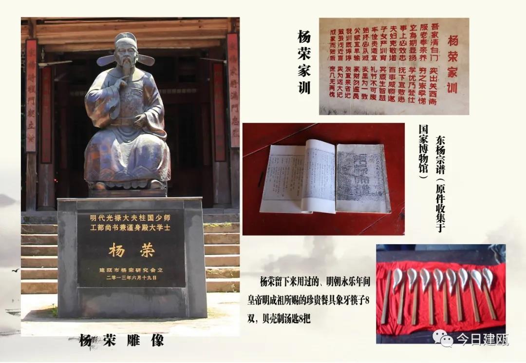 明正統三年(1438年)楊榮升從一品少師,明英宗皇帝賜建“登瀛坊”。牌坊沒有使用一枚釘子,全部用榫頭對接。“瀛洲”本為傳說中神仙居住的地方,在這里寓意著楊榮的治國安邦才能達到了登峰造極的境界,可登上這一大雅之堂。登瀛坊是對楊榮勤政愛民、治國安邦功績褒揚的輝煌歷史象征,也是激勵后人弘揚他篤實睿智和報效國家的良好教育場所。登瀛坊是先人留下的寶貴的文化遺產,于1995年被確認為建甌市級重點保護文物單位。2013年在楊氏祠堂內塑楊榮銅像。