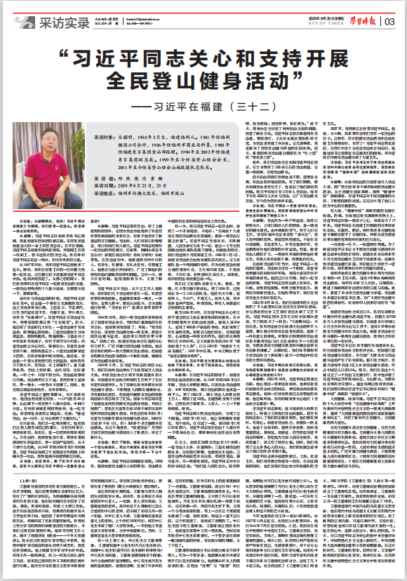 采訪對象:朱韶明,1958年3月生,福建福州人。1981年任福州糖酒公司會計,1986年任福州市商業局科員,1988年任福建東百集團食品部經理。1990年至2002年任福建東百集團副總裁。1999年至今任省登山協會會長,2001年至今任省登山協會山地救援隊總隊長。 采 訪 組:邱 然 陳 思 黃 珊 采訪日期:2019年8月23日、25日 采訪地點:福州市西湖大酒店,福州市鼓山 采訪組:朱韶明同志,您好!習近平同志在福建工作期間,你們經常一起登山。請您講一講這段經歷吧。 朱韶明:習近平同志任福州市委書記期間,我是福建東百集團的副總裁。東百集團是福建最大的一家上市百貨公司。在節日期間,習近平同志視察市場供應情況,并慰問工作第一線職工,曾來過我們百貨公司。我有幸和習近平同志見過一兩次,但沒有更多的交流。 從1997年開始,我和習近平同志接觸多了起來。那時,我和在省里工作的一位好朋友經常一起登山,這位朋友后來就邀請習近平同志參加。他高興地答應了。從那之后的周末,我們就經常和習近平同志一起沿著鼓山的古道,一路登山到終點的十八景休息站,在那里休息一下,聊聊家常。 最初參與登山運動的時候,習近平同志就樂在其中。鼓山是一個頗有文化底蘊的地方,山上有很多摩崖石刻,上起北宋,下迄清代,以至當代延續近千年,內容豐富,字體俱全,被譽為“東南碑林”。習近平同志在登山過程中,經常駐足欣賞這些“文化瑰寶”。后來,他總結了登山的幾大好處:一是登山屬于有氧運動,能增強心肺功能;二是登山需要全身協調運動,能鍛煉肌肉、增強骨骼;三是山林之中有很多負氧離子,有利于調節身體機能;四是登山能讓身心放松,緩解壓力;五是登山要堅持不懈,能鍛煉意志力;六是登山能夠親近大自然,在移步換景中陶冶情操。他還說,登山是一個男女老幼皆行的全民運動,福州的冬天不算太冷,登登山,身上就暖和了;夏天雖然炎熱,但山上有樹蔭,山風習習,比較涼爽。一年之中,只要不刮臺風,登山運動都可以開展。鼓山離市區又不遠,老百姓穿上運動鞋,帶一瓶水、一塊毛巾來就夠了。因此,他覺得這項運動很經濟,效果非常好。 習近平同志之前經常游泳,身體素質很好,他登山的速度比較快,一口氣能登40分鐘,從山腳下一直登到十八景休息站,中間不休息。有時彭麗媛老師回到福州,也一起登山。彭老師也很喜歡這項運動,她說:“通過登山,出一身汗,讓身心得到了全面放松。” 在休息站,我們會一起喝茶聊天,他把我們這些人都當成自己的朋友,沒有任何架子,講話很親切、很實在,是一位把情看得很重的人。來登山時,他穿著也很樸素,常穿省里搞活動時發的運動衣,穿一雙國產運動鞋,從來不穿什么名牌。從1997年到2002年的5年時間里,習近平同志每兩三個星期就會利用周末時間來登一次山,直到他離開福建到浙江任職。 采訪組:在您看來,除了有利于身體健康,還有什么原因讓習近平同志一直喜愛登山運動? 朱韶明:習近平同志喜歡登山,除了上面提到的原因外,還因為登山為他提供了和老百姓零距離接觸的更多機會,有助于他更好了解基層的方方面面。登山時,人們踩著石階慢慢走,可以和同行的人聊天。習近平同志經常和一起登山的市民聊天,拉家常,問問小孩念書怎么樣?家里住房還好嗎?看病方便嗎?如此等等。在登山過程中,他能遇到各種各樣的人,有學生,有游客,有私企老板,有普通工人,他都會與他們并肩同行,廣泛了解他們的情況和他們面臨的困難和問題。這樣一來,周末休息時間,他既能鍛煉身體,又能了解民情。 習近平同志來登山,從不讓工作人員陪同,就和我們幾個登山愛好者在一起,和老百姓零距離地接觸。他通常就拿著一瓶水、一條毛巾,走到人群中,群眾認出他來,會主動跟他打招呼:“習省長好!”他都會微笑著揮手回應。 1999年10月,我們一些登山愛好者籌備成立了福建省登山協會,當時我們邀請他擔任名譽會長,他很爽快地答應了,并說:“我當名譽會長,就要給登山群眾做一些實事,推動全民登山健身運動,運動可以給百姓帶來幸福。”自此之后,福建省登山協會在他的關心和支持下,廣泛開展全民登山健身活動。他還指示我們組織一些大型群眾登山活動,把福建省的群眾登山活動推向一個新的高潮,確確實實為登山群眾做實事。 1999年11月,在習近平同志的親自關心下,我們在福州鼓山舉辦了全國首屆萬人登山大賽。中國登山協會主席李致新應邀參加大賽,對福建省登山協會所做的工作給予了充分肯定和高度評價。為了鼓勵發動更多群眾參加登山健身活動,不斷增進人民群眾健康福祉,李致新回北京后,把福建開展群眾登山的經驗向國家體育總局作了匯報。國家體育總局肯定了福建轟轟烈烈的群眾登山活動經驗,并向全國推廣,首先在大連等全國20多個城市發動并組織市民登山健身活動,并且還把每年的1月1日定為全國新年群眾登高健身活動日,同時在全國30個省(區、市)300多個點全面推開登山活動。從這個角度看,“福建登山”為當時全國全民登山健身活動注入了新活力,樹立了新樣本。 采訪組:我們了解到,福建省登山協會有一個登山救援隊,而這個救援隊是在習近平同志指示下建立起來的。請您介紹一下這個過程。 朱韶明:習近平同志看問題很敏銳。2000年,隨著福建登山健身人數的增加,登山群眾中遇險和迷路的情況呈快速上升趨勢。 有一次,我與習近平同志一起登山