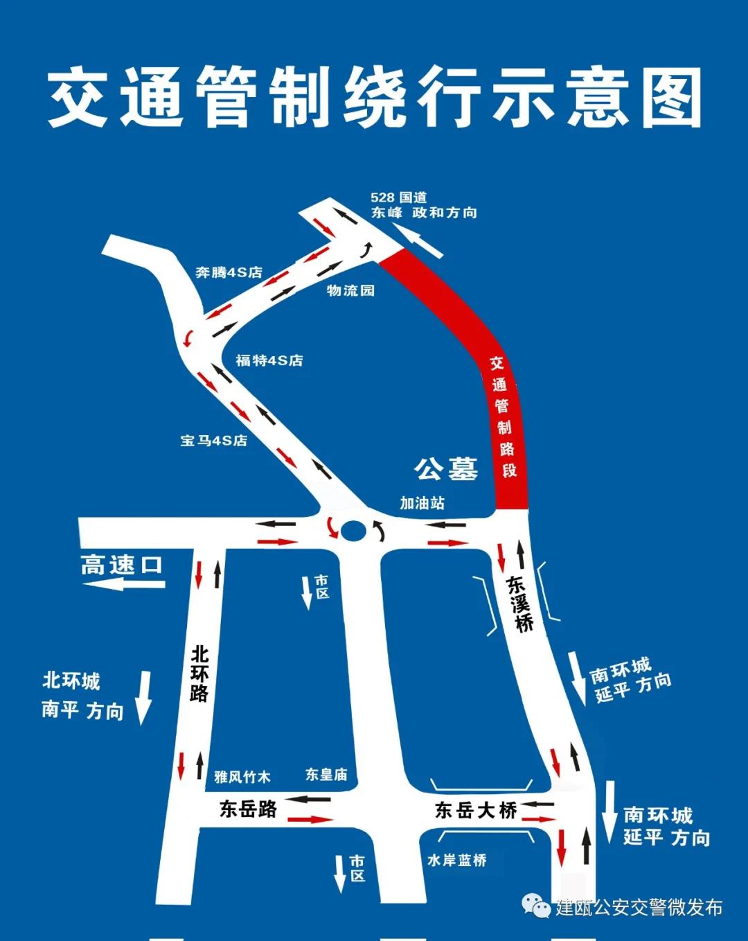 根據《中華人民共和國道路交通安全法》有關規定,以及建甌市新冠肺炎防控工作領導小組辦公室和建甌市民政局《關于2021年清明節祭掃活動有關事項的通告》的精神,決定從2021年4月2日至4月6日(清明節期間),每天7:00至17:00建甌市東溪大橋至公墓路段實行交通管制,禁止一切車輛通行,現將有關事項通告如下: 一、道路交通管制,車輛臨時繞行路段: 1、由東往西進入市區的車輛,一是由就近高速入口上高速繞行;二是經工業園區繞行至東門高速環島,再進入市區。 2、由東往西前往延平方向的車輛,一是由就近高速入口上高速繞行;二是從528國道,經工業園區—東門高速環島—北環路—東岳路—東岳大橋—南環路進行繞行。 3、由西往東前往東峰、政和方向的車輛,可從南環路—東岳大橋—東岳路—北環路—東門高速環島—工業園區—528國道繞行。 4、繞城行駛的大型客貨車輛,可臨時經由南環路—東岳大橋—東岳路—北環路進行繞城行駛。 二、交警部門提醒: 1、因疫情防控需要,所有車輛(含:摩托車、電動車、公交車)不得進入管制路段,乘坐公交一律在汽車東站上下車。 2、清明期間,人車流量較大,因條件限制,公墓周邊沒有停車場,建議我市市民錯峰乘坐公交車,前往祭掃。 3、前往公墓祭掃的民眾,請提前準備好八閩健康碼,保持社交距離,步行進入測溫通道。 |