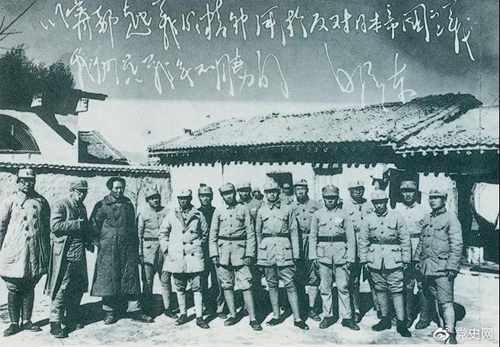 1931年12月14日,國民黨第二十六路軍在趙博生、董振堂、季振同、黃中岳率領下,于江西寧都起義,加入工農紅軍,編為紅軍第五軍團。圖為1937年毛澤東、王稼祥、蕭勁光與寧都起義的參加者在延安合影。 |