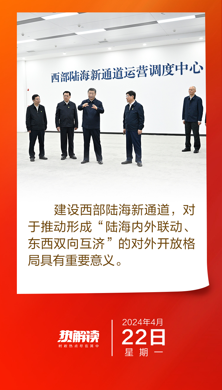 總書記一直對這條通道的建設十分關切。近年來,總書記在貴州、陜西、廣西等西部陸海新通道沿線省區考察時,多次對高水平共建西部陸海新通道作出重要指示。 作為我國重要的國家中心城市、中西部地區唯一直轄市,重慶在區域發展和對外開放格局中具有獨特且舉足輕重的地位。 以重慶為運營中心、各西部省區市為關鍵節點的西部陸海新通道,利用鐵路、海運、公路等運輸方式,北接絲綢之路經濟帶、南連21世紀海上絲綢之路,協同銜接長江經濟帶,一舉扭轉了西部內陸地區在對外開放中區位劣勢,奠定了重慶重要的戰略地位。 而總書記此次考察的重慶國際物流樞紐園區,則是中歐班列(渝新歐)、西部陸海新通道鐵海聯運班列的始發站,它向東西南北四個方向開行的國際班列線路達到62條,能夠輻射112個國家的503個港口,中歐班列(成渝線)綜合運行指標長期保持全國第一。 專家認為,中歐班列與西部陸海新通道的互聯互通,對外有效銜接“一帶一路”,對內促進西部地區擴大開放,有助于進一步推進構建以國內大循環為主體、國內國際雙循環相互促進的新發展格局。 西部陸海新通道正在成為推動西部地區高質量共建“一帶一路”的強大引擎。