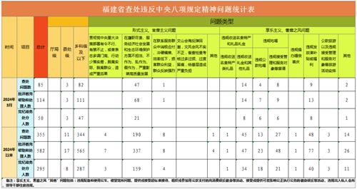 為及時準確掌握各地、各部門貫徹落實中央八項規定精神的情況,福建省紀委建立并實施落實中央八項規定精神情況月報制度。從2015年2月開始,每月通過福建省紀委監委網站對外公布月報數據,傳導工作壓力,持續釋放執紀必嚴的強烈信號,形成有力震懾,堅決防止不良作風反彈回潮。 2024年3月,福建省查處違反中央八項規定精神問題85件,批評教育幫助和處理114人,給予黨紀政務處分50人。福建省2024年以來查處違反中央八項規定精神情況如下: