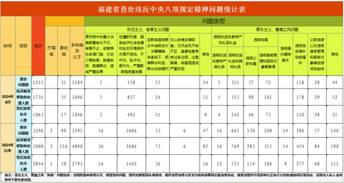 為及時準確掌握各地、各部門貫徹落實中央八項規定精神的情況,福建省紀委建立并實施落實中央八項規定精神情況月報制度。從2015年2月開始,每月通過福建省紀委監委網站對外公布月報數據,傳導工作壓力,持續釋放執紀必嚴的強烈信號,形成有力震懾,堅決防止不良作風反彈回潮。 2024年6月,福建省查處違反中央八項規定精神問題1215件,批評教育幫助和處理1731人,給予黨紀政務處分1063人。福建省2024年以來查處違反中央八項規定精神情況如下: