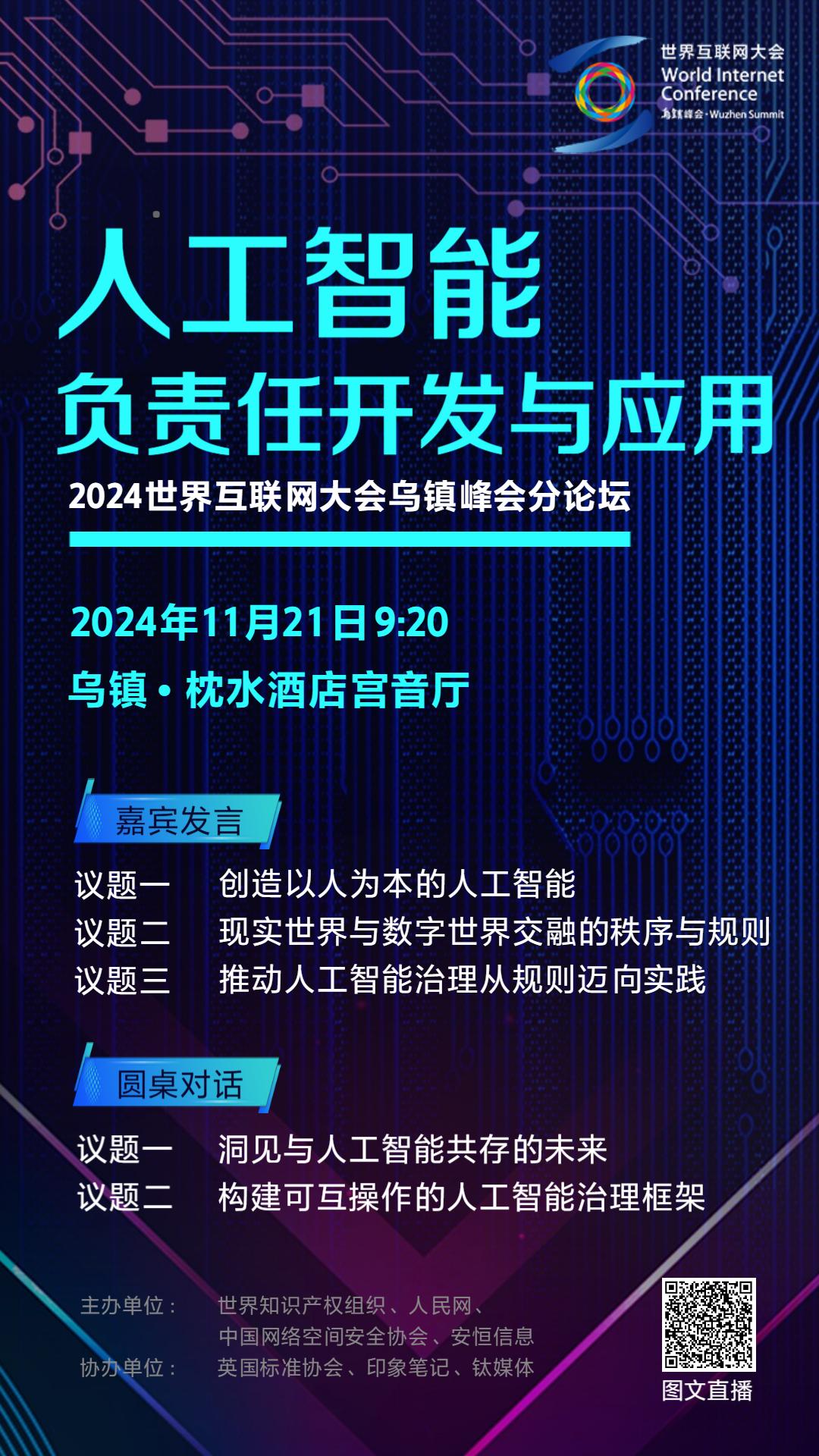 2024年初冬,“烏鎮時間”再次開啟。來自世界各地的嘉賓相聚世界互聯網大會烏鎮峰會,坐而論道、共商大計。 今年,人工智能成為熱議焦點。作為新一輪科技革命和產業變革的重要驅動力,這一技術在深刻改變人們生產生活的同時,也可能帶來未知的風險。因此,確保“智能向善”,發展負責任的人工智能,成為全球共同關注的關鍵議題。 如何做到“以人為本、智能向善、造福人類”?11月21日,烏鎮峰會期間,人工智能負責任開發與應用分論壇將匯聚國內外頂尖專家學者及行業領袖,圍繞這一重要話題開啟一場別開生面的思想盛宴。 大咖聚首,共繪“智能向善”新藍圖 嘉賓主旨發言環節將圍繞“創造以人為本的人工智能”“現實世界與數字世界交融的秩序與規則”以及“推動人工智能治理從規則邁向實踐”三大核心議題展開。 全國政協委員、中國網絡空間安全協會理事長趙澤良,中國工程院院士、同濟大學校長鄭慶華,人民網董事長、傳播內容認知全國重點實驗室主任葉蓁蓁,香港理工大學視覺計算講座教授、歐洲人文和自然科學院外籍院士陳長汶,深圳理工大學計算機科學與控制工程學院院長、美國醫學與生物工程院院士潘毅,安恒信息董事長范淵等多位嘉賓將分享最新觀點。 深度研討,展望“人機共存”新愿景 在圓桌對話環節,中國科學院自動化研究所人工智能倫理與治理中心主任、聯合國人工智能高層顧問機構專家、北京人工智能安全與治理實驗室主任曾毅,劍橋大學智能未來研究中心項目主任、劍橋大學生存風險研究中心創始執行主任、中英人工智能倫理與治理中心聯合主任肖恩·歐·海格緹,美國奧爾布賴特石橋集團合伙人及副總裁保羅·特里奧洛,香港醫院管理局資訊科技及醫療信息部總經理余法昌等嘉賓,將圍繞“洞見與人工智能共存的未來”“構建可互操作的人工智能治理框架”等議題展開對話討論。 相約烏鎮峰會,共話智能未來。該論壇由世界知識產權組織、人民網、中國網絡空間安全協會、安恒信息主辦,英國標準協會、印象筆記、鈦媒體協辦。論壇旨在促進建設多主體參與、多層面治理的人工智能科研、轉化與發展機制,共同推動構建人工智能技術、產業發展的良好生態。