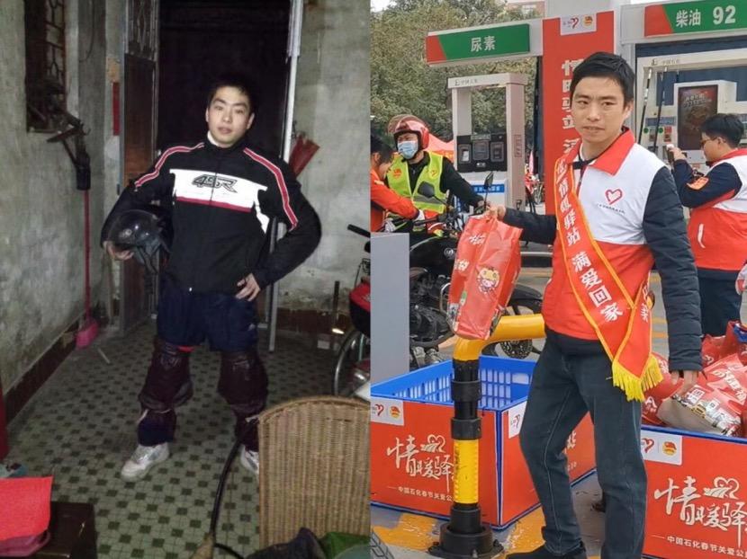 左圖為王富忠2015年第一次開摩托車返回家鄉(采訪對象供圖),右圖為王富忠2025年在廣東佛山龍山加能站做志愿者服務。(魏曉航 攝) “我曾經也是返鄉摩騎的一員,現在我開車回家了。”王富忠說。“印象最深的是2018年那次,我們晚上經過廣州下了雨,我的摩托車壞了,那時候摔了一跤,行李也撒了一地,剛好在不遠處就有志愿者出來幫我把行李綁好,還把摩托車推到加油站。” 從此,王富忠就成為了一名“情暖驛站”的志愿者。記者日前又看到他在驛站忙碌的身影。他把一包包福袋送到“返鄉摩騎”手中。“讓更多的老鄉們回家的路更溫暖,是我一直念念不忘的事情。”王富忠說。 盡管鐵路、公路客運四通八達,但是付中明還是一直選擇騎摩托回鄉。“不僅經濟,而且自由、方便,沿途想停就能停。”他笑著說。 “其實現在騎摩托回家也挺好,高速公路多了,轎車、貨車都走高速路,我們走國道,車流量小,路變寬敞了,沿途還能遇到不少摩友,路上有伴,并不寂寞。”一位摩騎說。 |