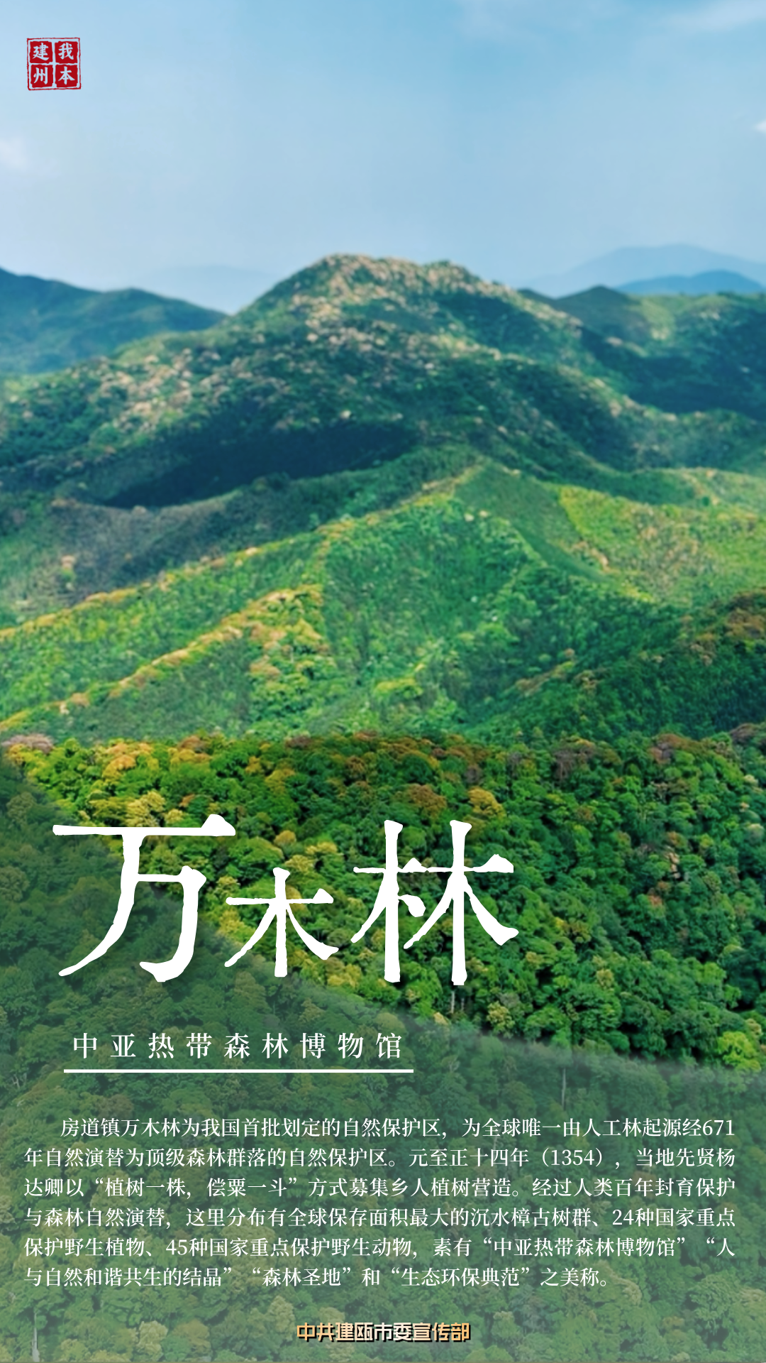 房道鎮萬木林為我國首批劃定的自然保護區,為全球唯一由人工林起源經671年自然演替為頂級森林群落的自然保護區。元至正十四年(1354),當地先賢楊達卿以“植樹一株,償粟一斗”方式募集鄉人植樹營造。經過人類百年封育保護與森林自然演替,這里分布有全球保存面積最大的沉水樟古樹群、24種國家重點保護野生植物、45種國家重點保護野生動物,素有“中亞熱帶森林博物館”“人與自然和諧共生的結晶”“森林圣地”和“生態環保典范”之美稱。 |