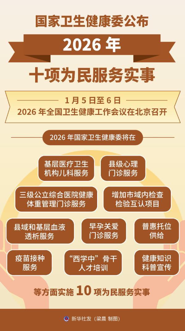 新華社北京1月6日電(記者李恒)國家衛生健康委2026年將持續實施一批新的為民服務實事,同時繼續優化提升2025年為民服務實事規范化水平。 1月5日至6日,2026年全國衛生健康工作會議在北京召開。這是記者從會上了解到的信息。 據介紹,2026年國家衛生健康委將在基層醫療衛生機構兒科服務、縣級心理門診服務、三級公立綜合醫院健康體重管理門診服務、增加市域內檢查檢驗互認項目、縣域和基層血液透析服務、早孕關愛門診服務、普惠托位供給、疫苗接種服務、“西學中”骨干人才培訓、健康知識科普宣傳等方面實施10項為民服務實事。