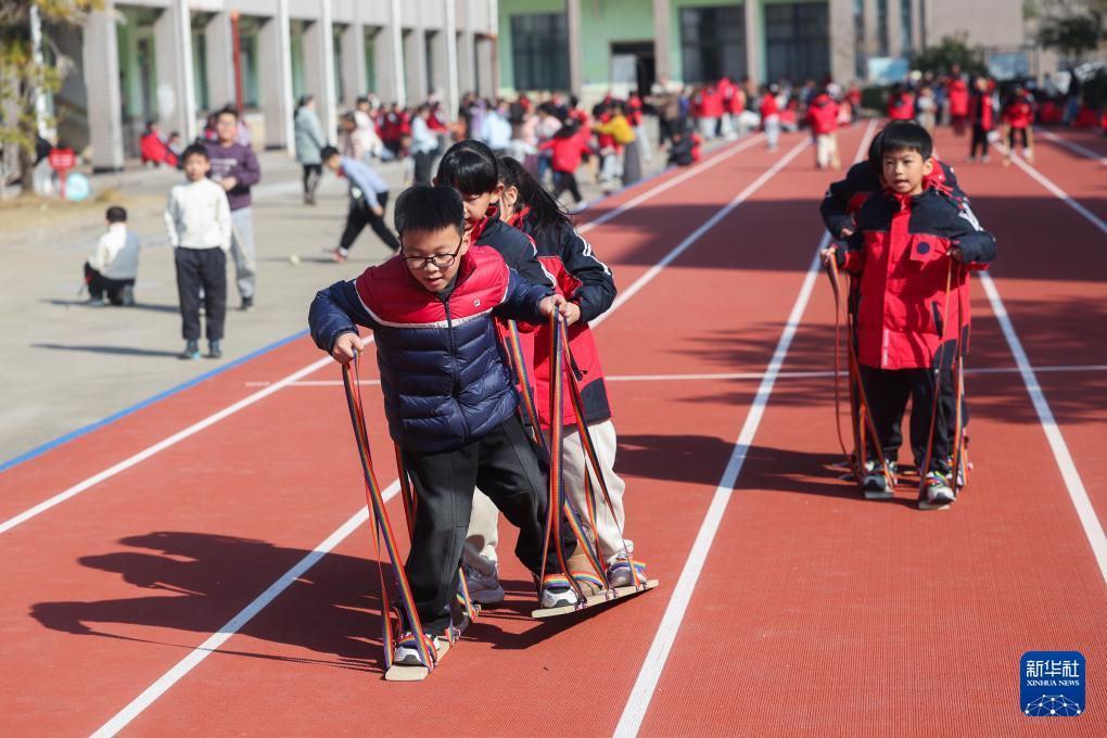 1月9日,諸暨市陶朱街道城西小學的學生在操場上參加走板鞋游戲。 近期,為豐富學生課間生活、傳承中華優秀傳統文化,浙江省諸暨市陶朱街道中心學校下屬各小學開設了傳統游戲課程,打陀螺、跳房子、踩高蹺等多項傳統游戲讓學生們玩得不亦樂乎。 新華社記者 徐昱 攝