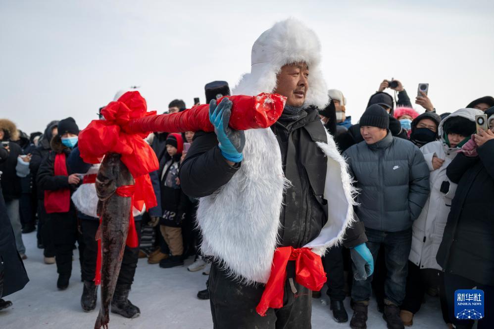 1月17日,在2026年興凱湖冬捕節現場,漁民展示冬捕的大魚。 新華社記者 張濤 攝 |