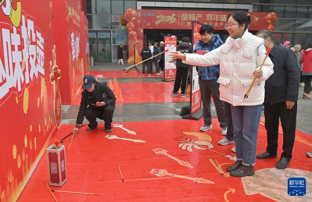 1月24日,在廣西南寧國際會展中心,市民在年貨大集現場體驗投壺。 1月23日至25日,2026年廣西脫貧地區農產品年貨大集在廣西南寧國際會展中心舉行。 新華社記者 周華 攝