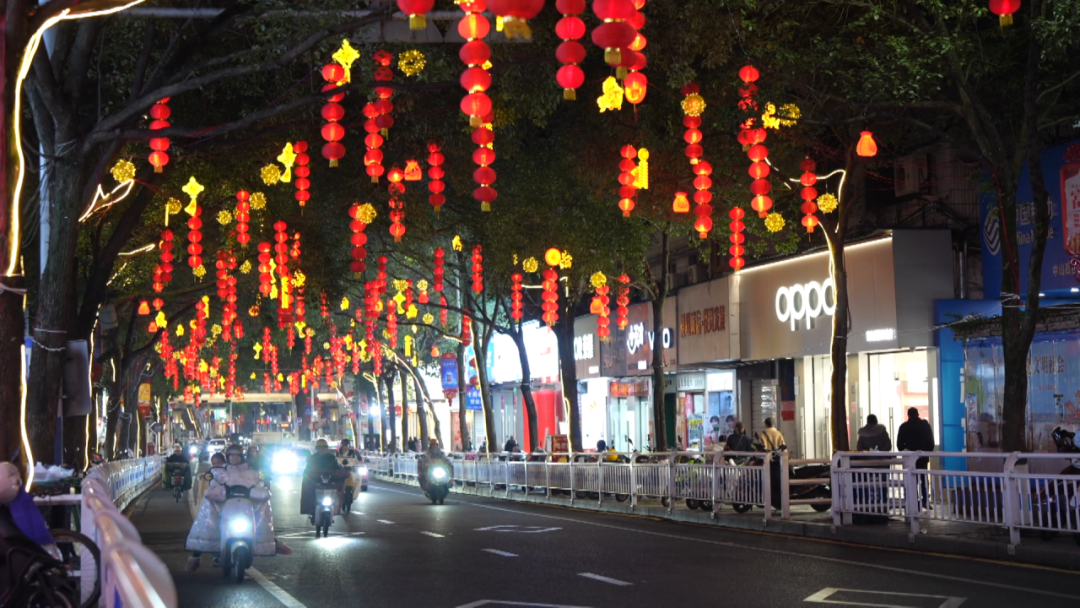 中山路上,數千盞小巧的紅燈籠連綿懸掛,宛如為古城戴上一條溫潤的“胭脂珠鏈”,又似發間輕搖的步搖,在夜色中微微蕩漾,平添幾分婉約靈動。細看枝頭,福字燈與馬型燈星星點點、隨風輕顫,猶如春夜枝頭綻開的微光花瓣。這朦朧搖曳的詩意景致,吸引行人紛紛駐足,舉起手機將這份美好定格留存。