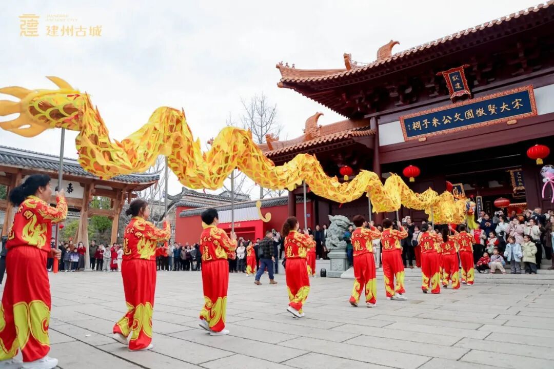 除了朱子婚禮,今年建甌的春節活動可謂好戲連臺。古老的通仙門上,一場現代激光秀將變幻的光影投射在斑駁的城墻之上,讓歷史建筑煥發出全新的光彩。在鐵井欄紫芝街口,極具特色的苗族牛頭吸引了不少好奇的市民前來嘗鮮。夜幕降臨,人們手拉手圍著篝火翩翩起舞,用熱情驅散冬夜的寒意,共慶新春佳節。此外,舞龍表演、名人主題快閃等活動輪番上演,整個古城仿佛一座沒有圍墻的沉浸式舞臺。
