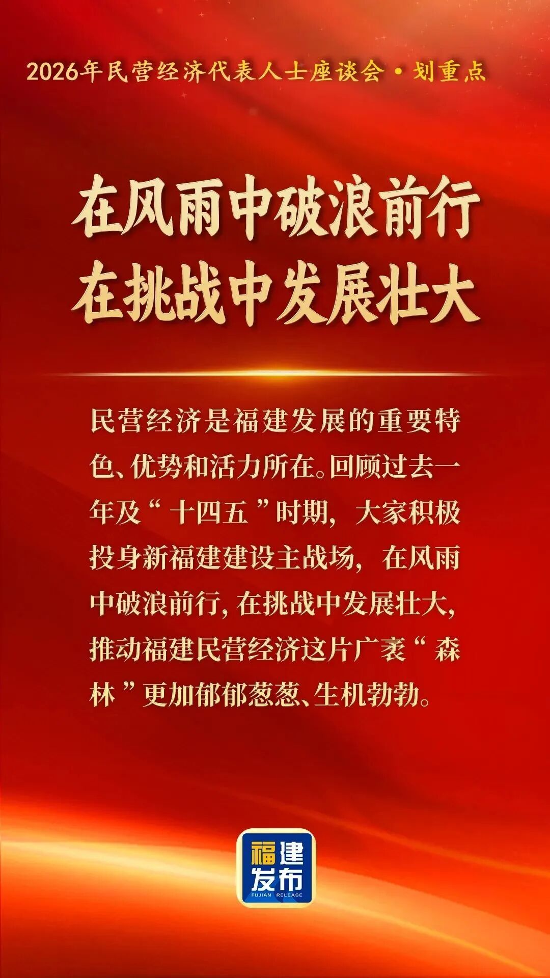 丙午馬年開假第一天,2月24日,省委、省政府連續(xù)第六年以“新春第一會(huì)”形式,在福州召開民營經(jīng)濟(jì)代表人士座談會(huì)。會(huì)上,省領(lǐng)導(dǎo)與民營企業(yè)家共同學(xué)習(xí)貫徹習(xí)近平總書記關(guān)于民營經(jīng)濟(jì)發(fā)展的重要論述,研究促進(jìn)民營經(jīng)濟(jì)健康發(fā)展、高質(zhì)量發(fā)展,激發(fā)“開局起勢”的強(qiáng)大動(dòng)力,以旗幟鮮明的態(tài)度、真真切切的尊重和實(shí)實(shí)在在的舉措,鼓勵(lì)和支持全省廣大民營企業(yè)和民營企業(yè)家堅(jiān)定信心、振奮精神、奮勇爭先,為實(shí)現(xiàn)“十五五”良好開局、奮力譜寫新征程新福建建設(shè)新篇章作出新的貢獻(xiàn)。省委書記、省人大常委會(huì)主任周祖翼出席并講話,省委副書記、省長趙龍主持。省政協(xié)主席滕佳材,省委副書記、福州市委書記郭寧寧出席。 讓我們通過一組海報(bào) 速覽會(huì)議要點(diǎn) ↓↓↓