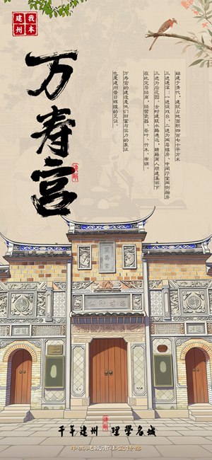 始建于清代,建筑占地面積四百七十平方米,三進遞深:一進設戲臺,二進為兩層樓房、中間廳堂兩側廂房,三進為后花園。古時建甌水路通達,贛籍商人順建溪而下,在此定居經商,經營瓷器、茶葉、竹木、布綢。萬壽宮的建造是他們財富與實力的象征,也是建州昔日輝煌的見證。 |