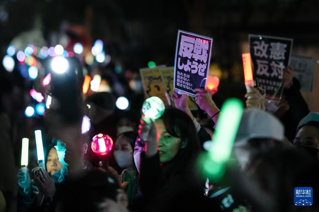 2月27日,在日本東京的首相官邸前,民眾參加抗議活動。 針對日本首相高市早苗近期釋放的修憲信號,大批日本民眾2月27日晚在東京首相官邸前舉行抗議集會,反對高市修憲企圖。 新華社記者 賈浩成 攝