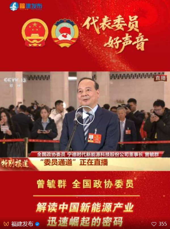 今天下午 全國政協委員 寧德時代新能源科技股份公司董事長 曾毓群 亮相全國政協十四屆四次會議 首場“委員通道” 曾毓群介紹,這幾年,寧德時代建立了非常強勁的有韌性的供應鏈和生態體系。展望未來,寧德時代會加大研發投入,尤其是應用更多人工智能的方式。寧德時代會把中國的產品賣到全世界,同時也會把技術、標準推廣到全世界,跟全世界所有的同行一道繼續努力,真正為新能源事業作出卓越貢獻。 持續創新的寧德時代 作為我國新能源電池產業高地,福建的鋰電池產量、出口量連續多年居全國第一。作為行業龍頭,寧德時代動力電池裝機、儲能電池出貨量連續多年保持全球第一。 寧德時代累計研發投入超800億元,匯聚全球研發人員2萬多名,布局專利5萬多件,搭建21C創新實驗室、電化學儲能技術國家工程中心等高水平研發平臺,與國內外高校和科研院所開展聯合技術攻關。