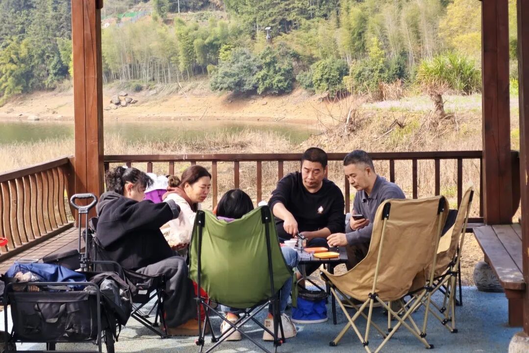 步入桃花島,仿若置身畫卷。山坡上、步道旁,粉黛桃花與金黃油菜花交相輝映,層層疊疊,鋪展出一幅生機盎然的春日圖景。游客三五成群,或駐足拍照,將笑靨與花影一同定格;或沿步道緩行,沉浸于山水相依的田園風(fēng)光。休憩亭中,有人引吭高歌,以山野為舞臺;水畔茶席旁,有人圍爐煮茶,品一口春日的清歡。動靜之間,盡顯人與自然的和諧相融。