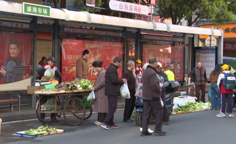 盛海市場門口路段每日清晨都有大量攤販聚集于機動車道形成“早市”。其中,既有周邊菜市場的經營戶,也有聞訊而來的流動攤販。這一現象帶來了嚴重的城市管理問題,原本雙向四車道的道路被擠占至僅剩兩車道,公交車無法正常進站停靠;攤販的經營喧鬧聲影響周邊居民休息;買菜的市民滯留機動車道,存在極大的交通安全隱患。