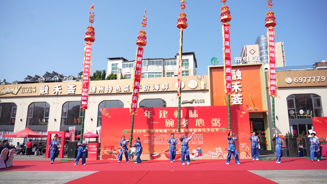 活動現(xiàn)場,挑幡、舞龍、舞獅、腰鼓等傳統(tǒng)民俗表演輪番登場,整個建州不夜城仿佛沉浸在一片歡樂的海洋中。 在與會嘉賓的共同見證下,“鄉(xiāng)宴嘉年華+拗九文化節(jié)”正式開啟,標志著這一文化盛宴的全面展開。
