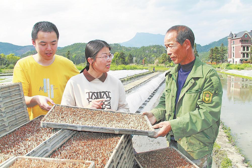 18日,順昌縣氣象局組織工作人員深入田間地頭,服務春耕春播,為糧食穩產增收筑牢氣象防線。圖為順昌縣氣象局技術人員在元坑鎮謨武村田間查看秧苗長勢,為進行育秧作業的農民提供氣象咨詢服務,并提出生產建議與防御措施。陳柏材 蔡元康 攝 |