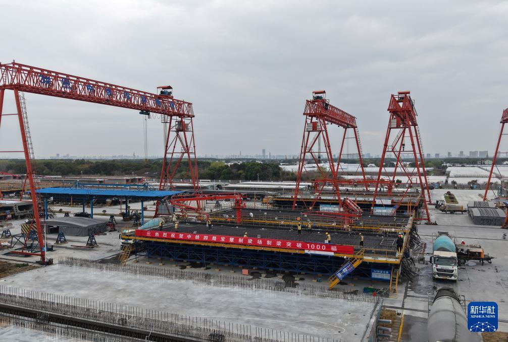 3月26日,空中俯瞰中鐵四局寶慧制梁場1000榀箱梁澆筑施工現場(無人機照片)。 3月26日,隨著一榀長32.6米、重673噸的箱梁順利完成澆筑,位于上海市寶山區的中鐵四局滬寧合高鐵滬寧段Ⅱ標寶慧制梁場預制箱梁產量成功突破1000榀大關,滬寧合高鐵滬寧段及滬通鐵路二期工程建設取得重要階段性成果,為后續大規模架梁施工和全線貫通奠定了堅實基礎。 滬寧合高鐵滬寧段是國家“八縱八橫”高速鐵路網沿江高鐵通道的重要組成部分,滬通鐵路二期亦是沿海通道的關鍵一環。兩條線路建成通車后,將在上海大都市圈、南京都市圈和合肥都市圈間建起一條快速新通道,對于優化沿長江地區鐵路網布局、服務長江經濟帶協同發展、推動長三角高質量一體化發展具有重要意義。 新華社記者 方喆 攝