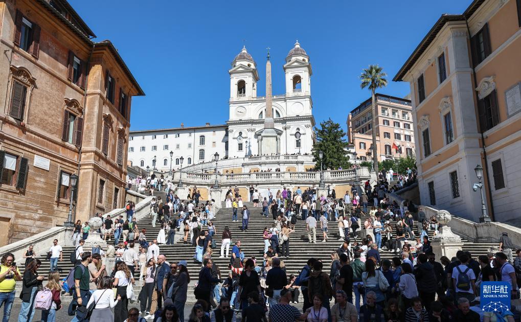 4月4日,游客在意大利首都羅馬的西班牙廣場參觀游覽。 復活節假期到來,意大利首都羅馬迎來客流高峰,人們來到斗獸場、許愿池、西班牙廣場等標志性景點參觀游覽,享受假日時光。 新華社記者 王楷焱 攝