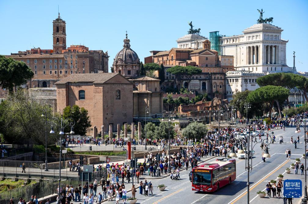 4月4日,人們走在意大利首都羅馬的帝國廣場大道上。 復活節假期到來,意大利首都羅馬迎來客流高峰,人們來到斗獸場、許愿池、西班牙廣場等標志性景點參觀游覽,享受假日時光。 新華社記者 王楷焱 攝
