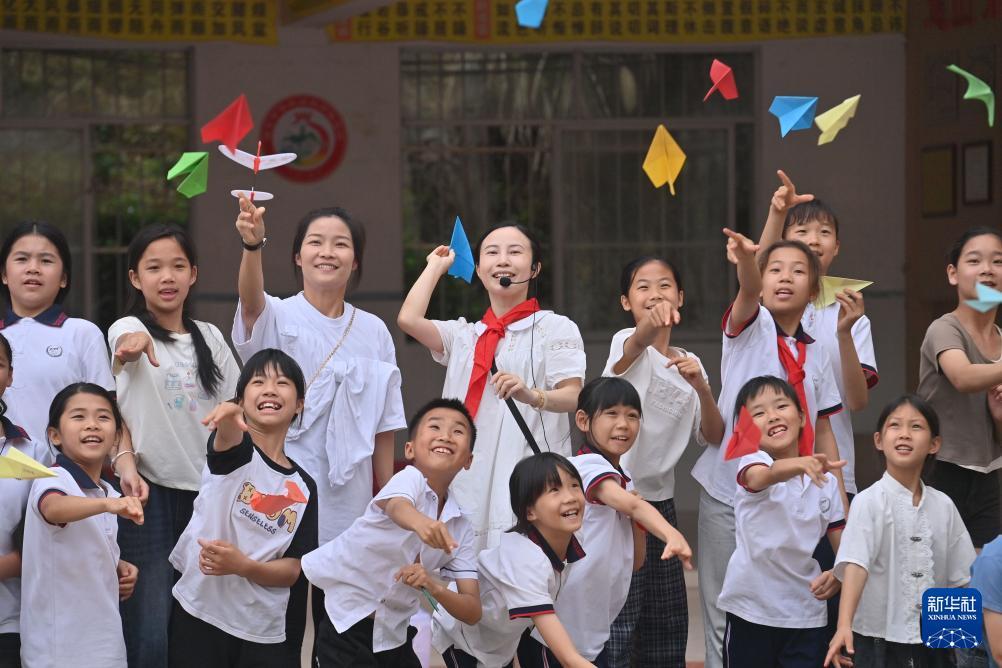 4月16日,在梧州市長(zhǎng)洲區(qū)倒水鎮(zhèn)大橋小學(xué),送教老師和學(xué)生一起放紙飛機(jī)。 4月16日,廣西梧州市長(zhǎng)洲區(qū)組織一批老師來到倒水鎮(zhèn)大橋小學(xué),開展送教下鄉(xiāng)活動(dòng),幫助鄉(xiāng)村小學(xué)學(xué)生了解非遺和科技知識(shí)。 新華社記者 黃孝邦 攝